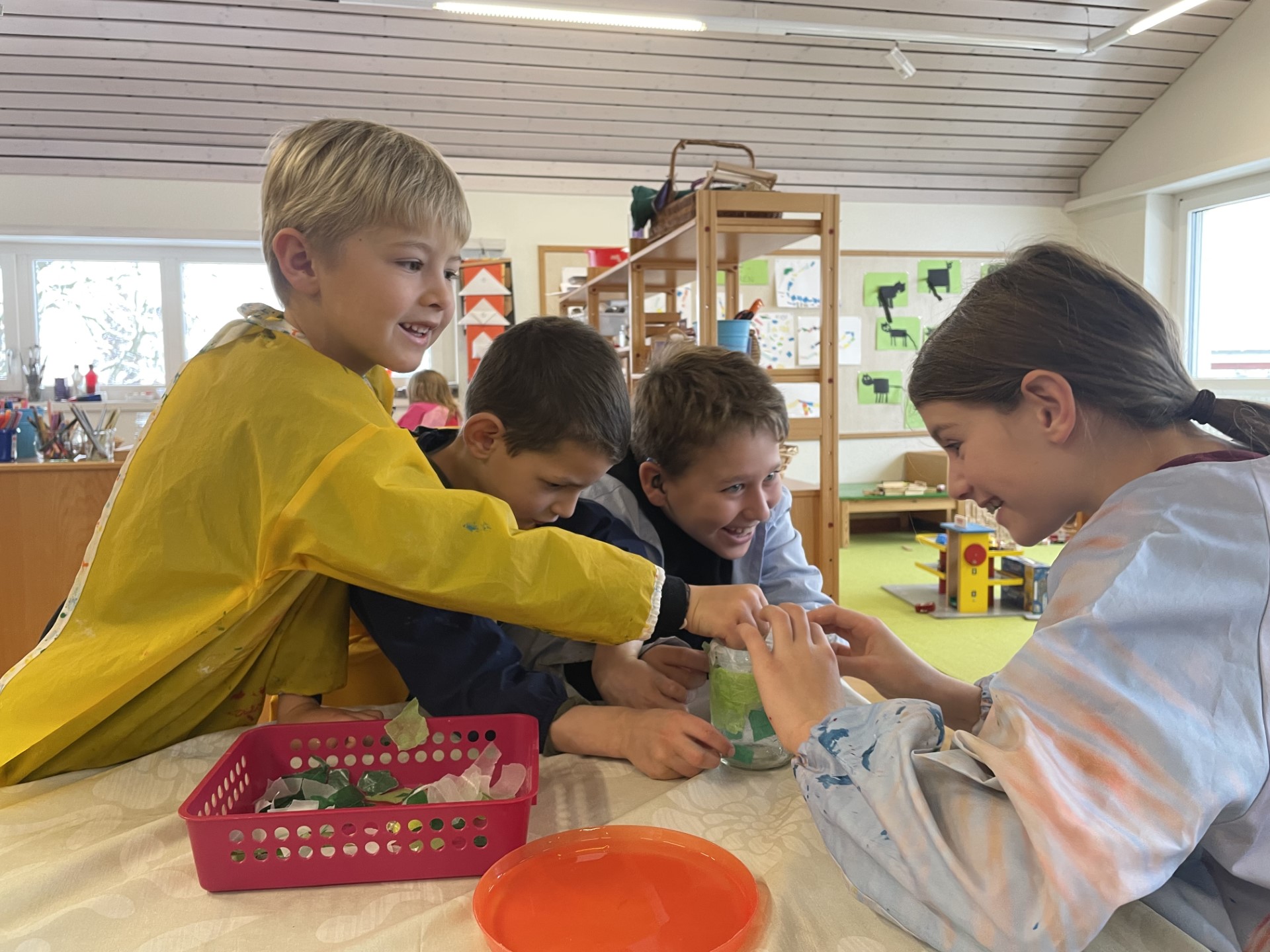 In der Basisstufe sind alle ganz fleissig am Gläser mit Seidenpapier bekleben. Neben dem Basteln summt man die Lieder mit, welche aus dem CD Player zu hören sind. Einfach schön… und alle ganz vertieft in ihre Arbeit.