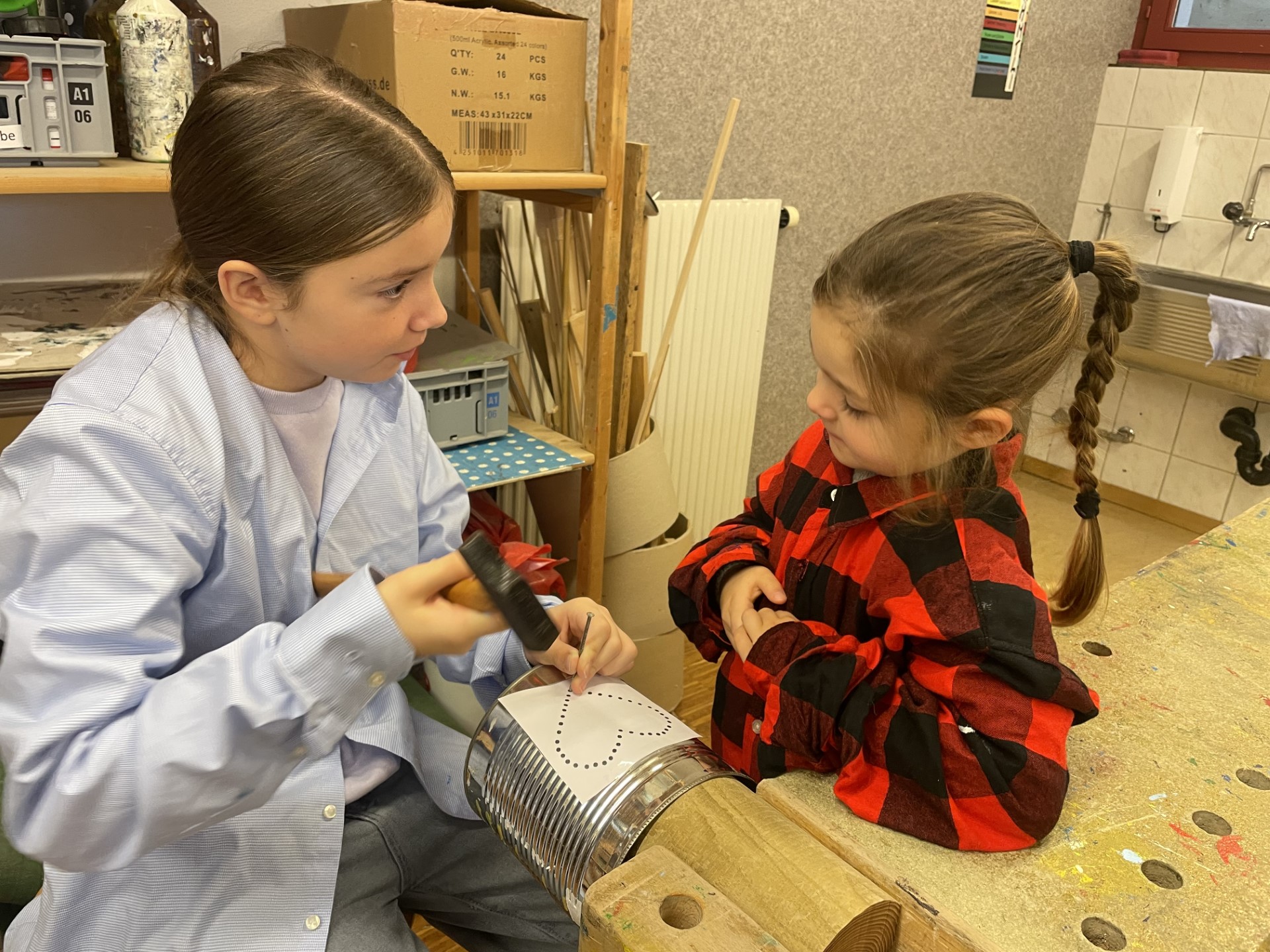 Im Werkraum werden Büchsen für die Dekoration hergestellt. Gross und Klein helfen einander und hämmern fleissig Löcher in die Büchsen.