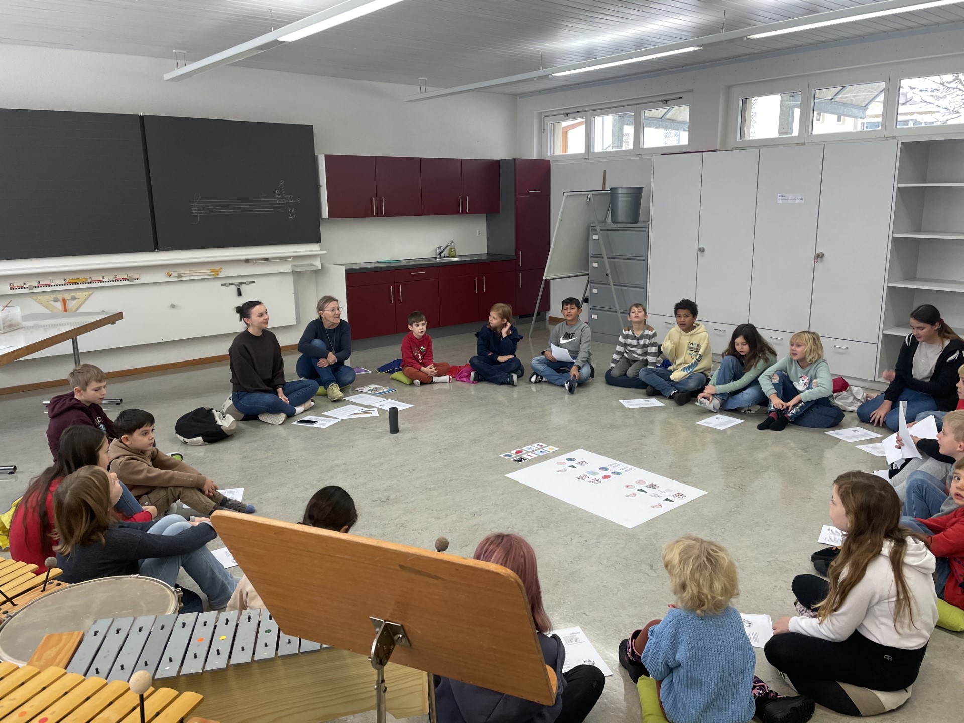 In den Götti- und Gottigruppen werden verschiedene Ateliers besucht. Aus dem Musikzimmer klingen Gitarrenklänge und fröhliche Kinderstimmen. Gemeinsam singen sie bekannte Weihnachtslieder, wie Felice Navidad und «Das Wiehnachtslied», begleitet von Rasseln und Glocken.