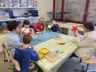 Im TTG Zimmer und im Schulzimmer der 5./6. Klasse riecht es nach Farben. Dort werden die Sterne für den Baumschmuck gemalt und verziert.